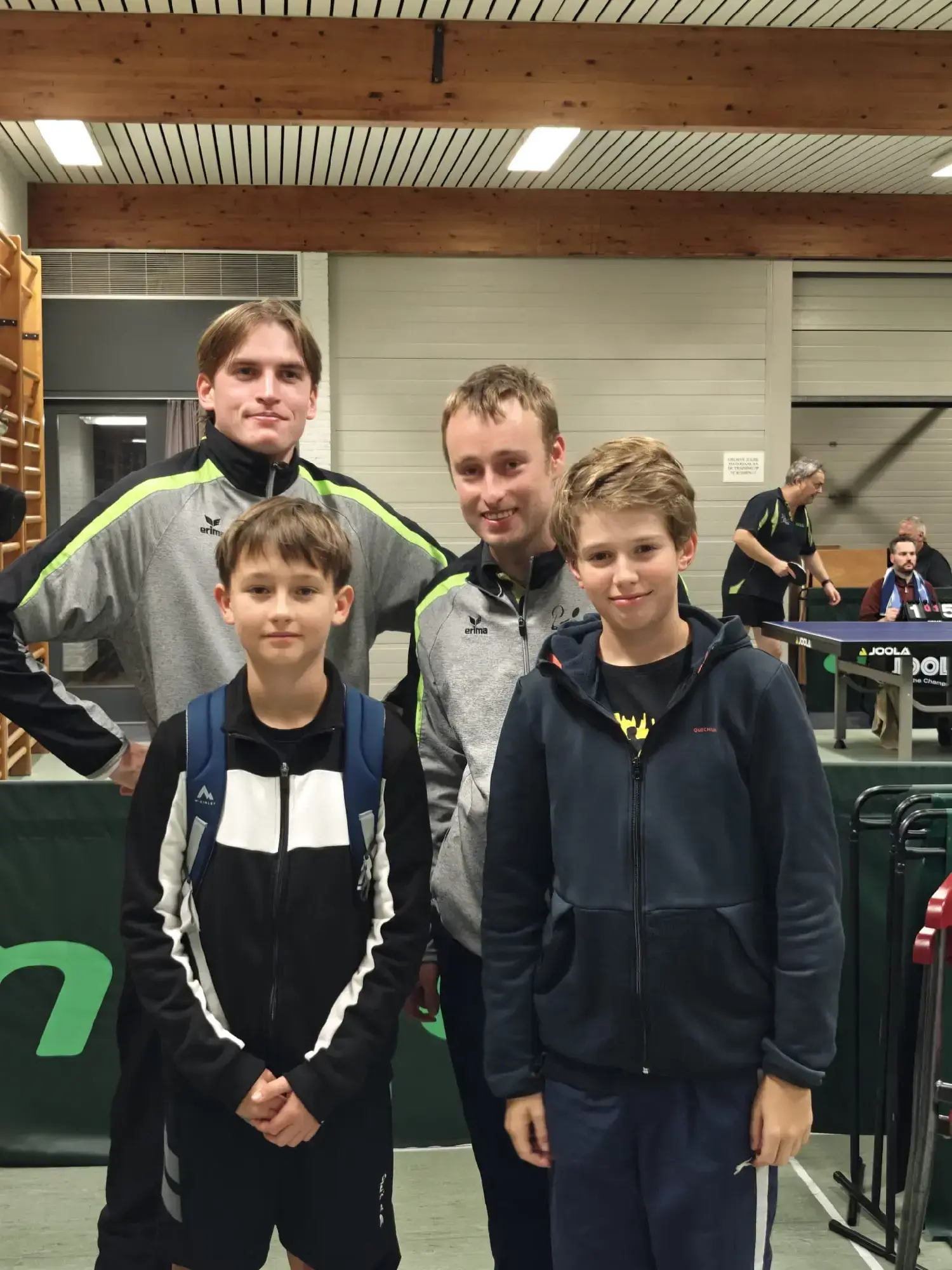 Ook bij de E was het best spannend. Beide ploegen waren aan elkaar gewaagd, het merendeel van de setstanden was uiteindelijk met slechts 2 of 3 punten verschil winst/verlies - duimen aflikken voor het publiek dus! Het werd uiteindelijk een 6-10 zege voor de onzen, met Daan, Sebastiaan en Xuan elk 3 zeges en ook Thomas won 1 belangrijke match.